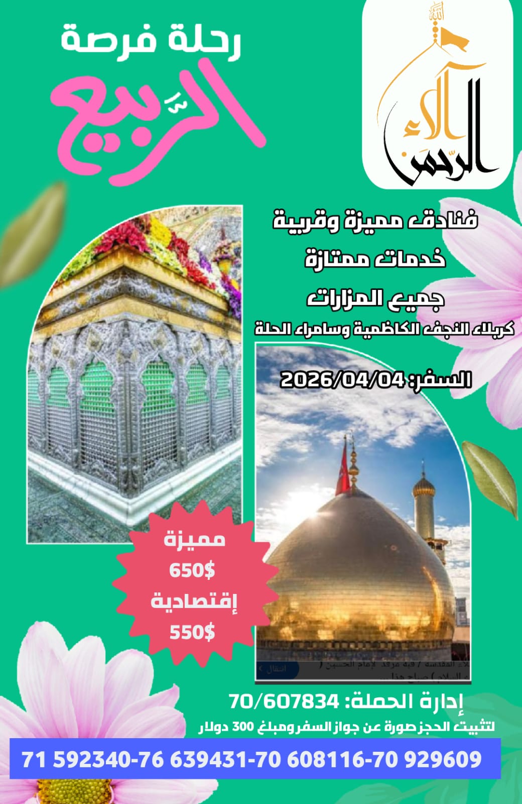 ننظم رحلات حج وعمرة ورحلات دينية وسياحية لزيارة العتبات المقدسة في العراق وإيران والسعودية وسوريا ولبنان