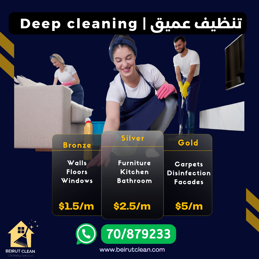 Beirut Clean is a professional cleaning company based in Beirut, offering deep cleaning, housekeeping, window cleaning, carpet and furniture cleaning, solar panel care, and water tank cleaning. Our trained team delivers reliable, high-quality service using safe products and modern equipment. We focus on hygiene, transparency, and customer satisfaction.