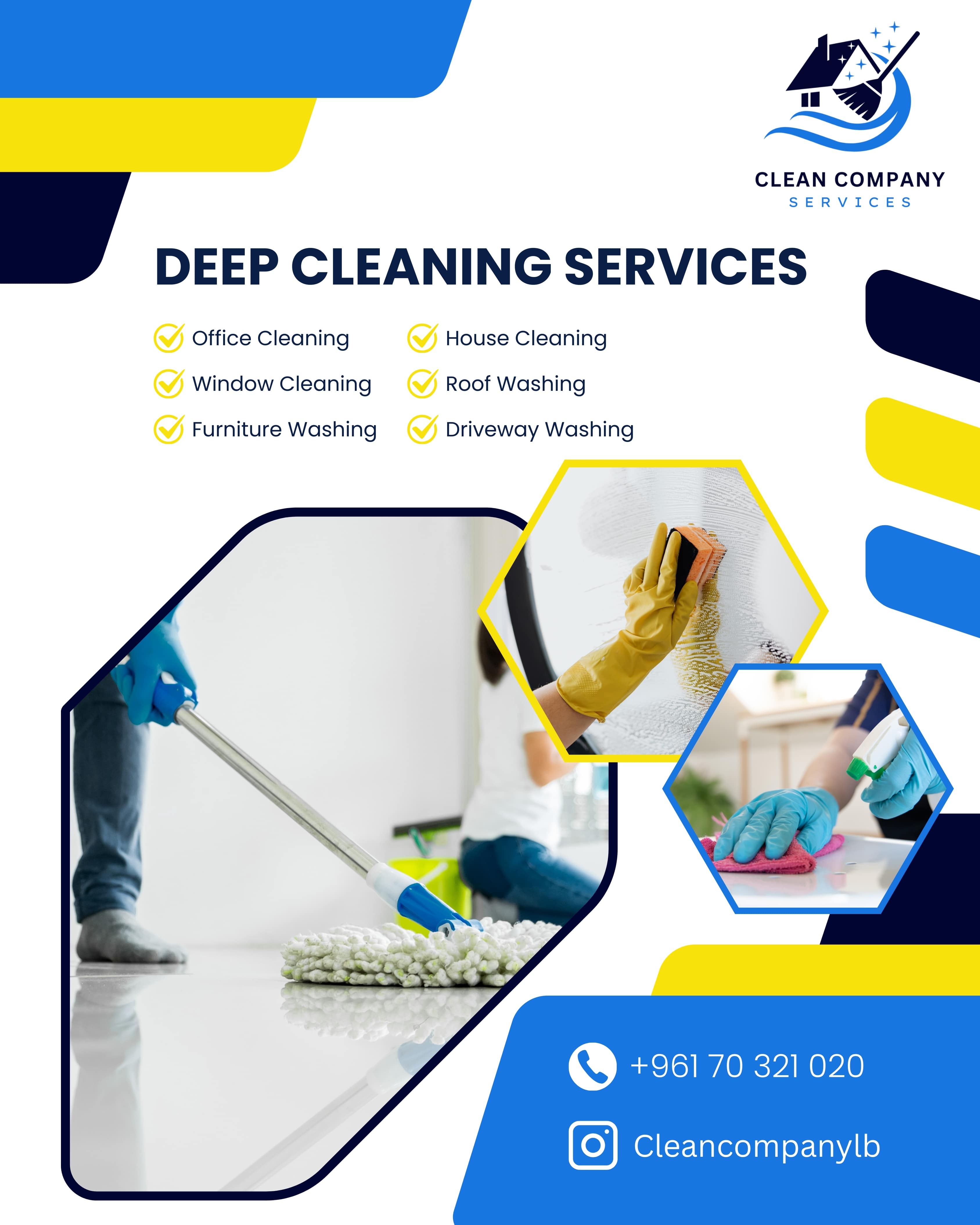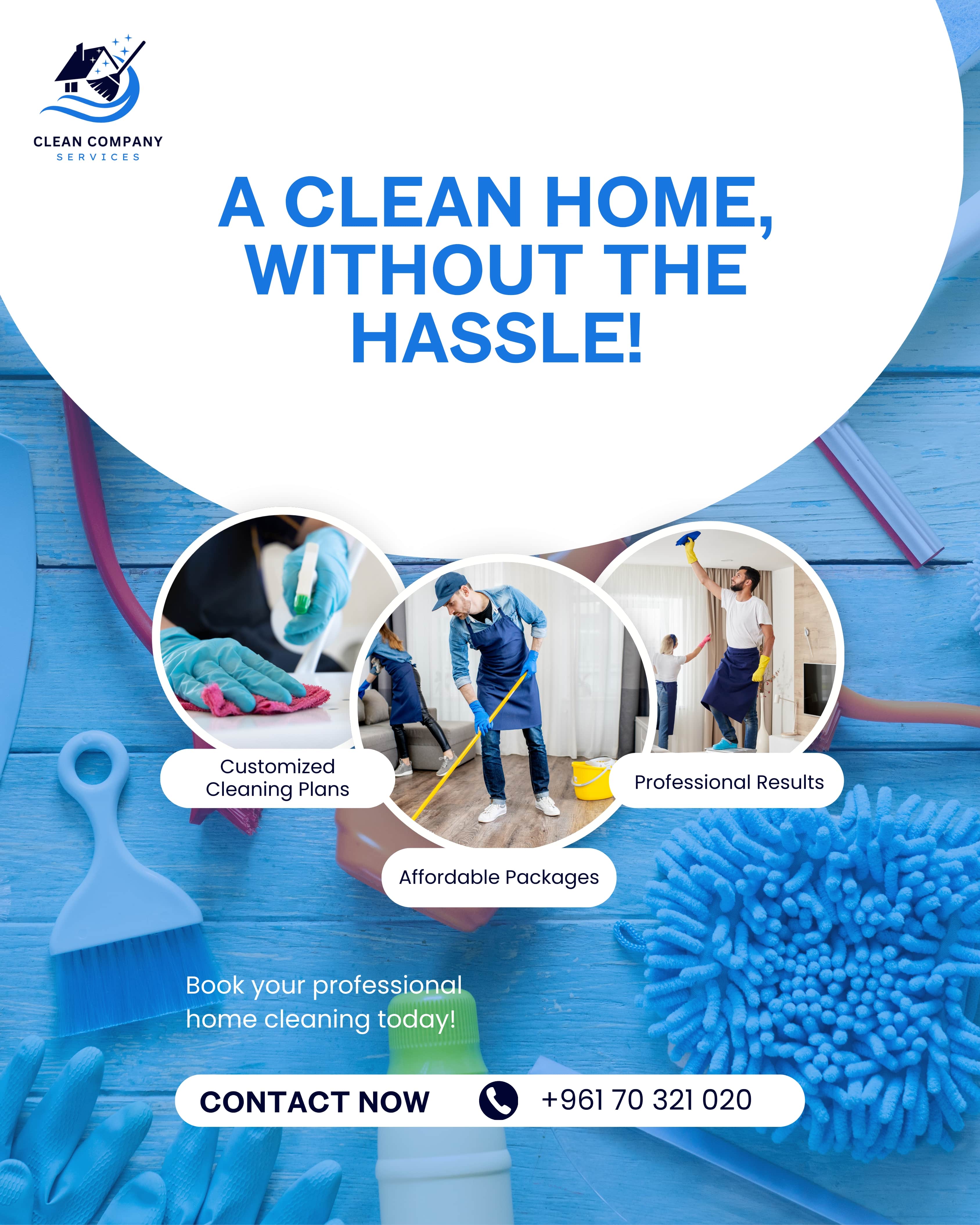 خدمات تنظيف شاملة للمنازل والمكاتب والشركات. فريقنا المحترف يضمن نتائج نظيفة ومشرقة من خلال التنظيف العميق، التعقيم، العناية بالأرضيات، تنظيف النوافذ، وخدمات الصيانة المنظمة حسب احتياجاتكم.
