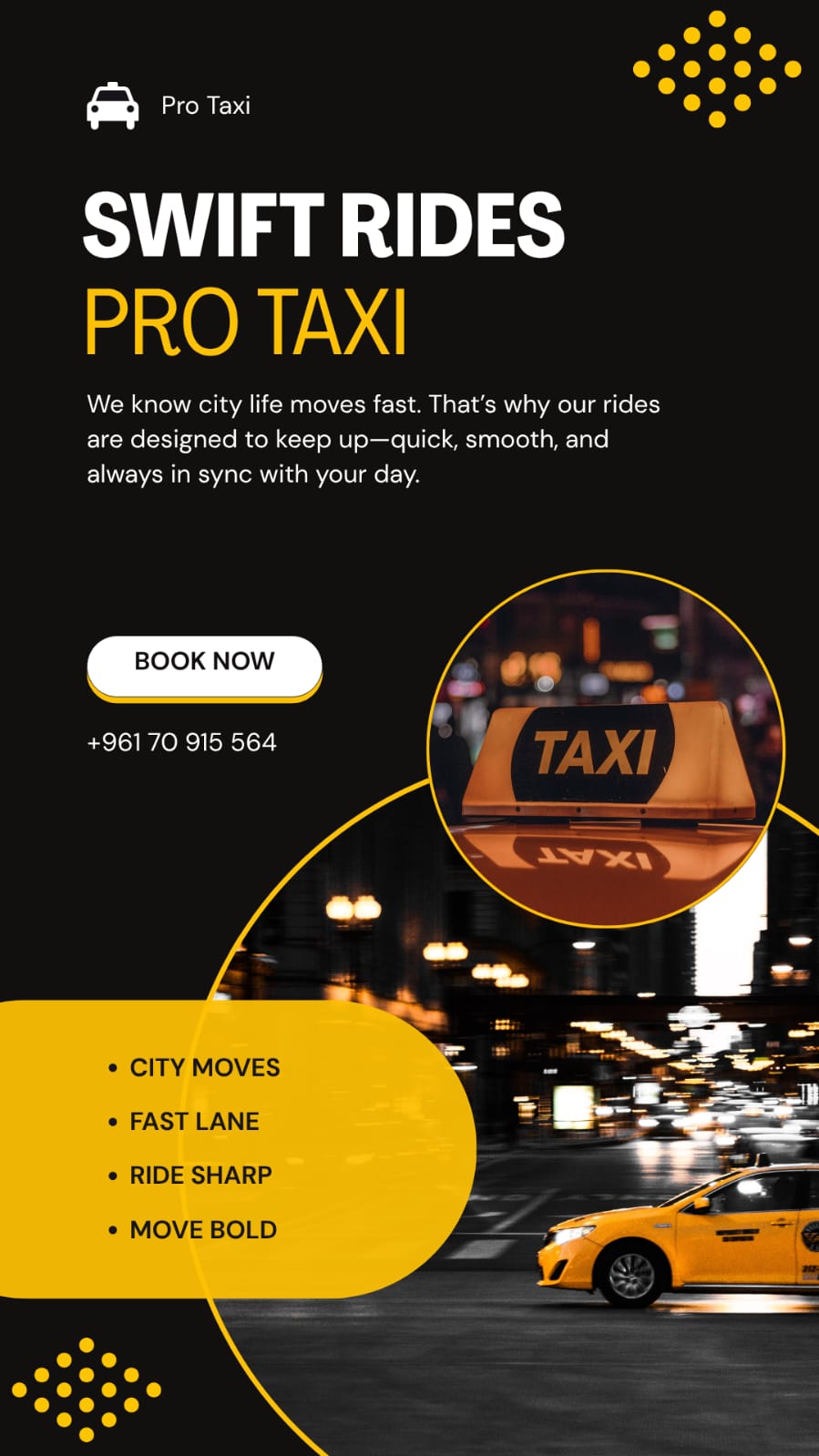 نوفّر خدمات تاكسي موثوقة وآمنة لتلبية جميع احتياجاتك في التنقّل. تشمل خدماتنا المشاوير داخل المدينة، التوصيل من وإلى المطار، الرحلات الطويلة، وخدمة النقل عند الطلب. مع سائقين محترفين، سيارات نظيفة، والالتزام بالمواعيد، نضمن لك رحلة مريحة وسلسة في كل مرة.