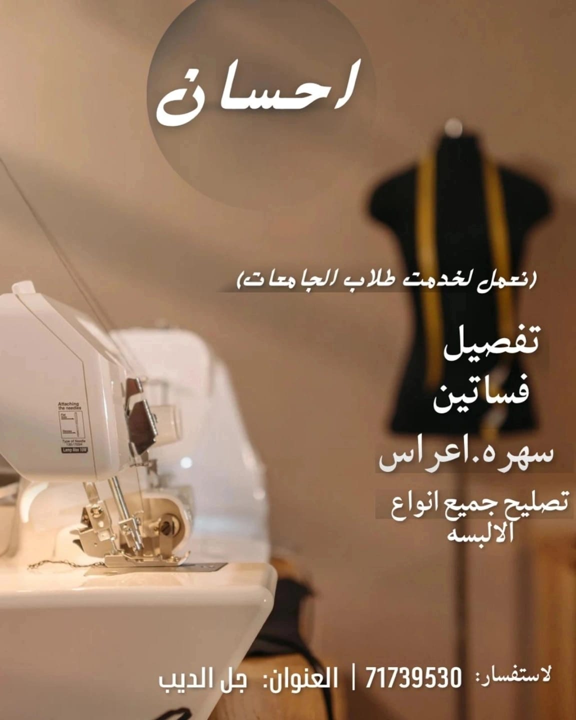 نقدّم جميع خدمات الإصلاح، تضييق وتوسيع الملابس، تصميم الفساتين، وترميم القطع التالفة لضمان إطلالة مثالية ومقاس مريح لكل زبون